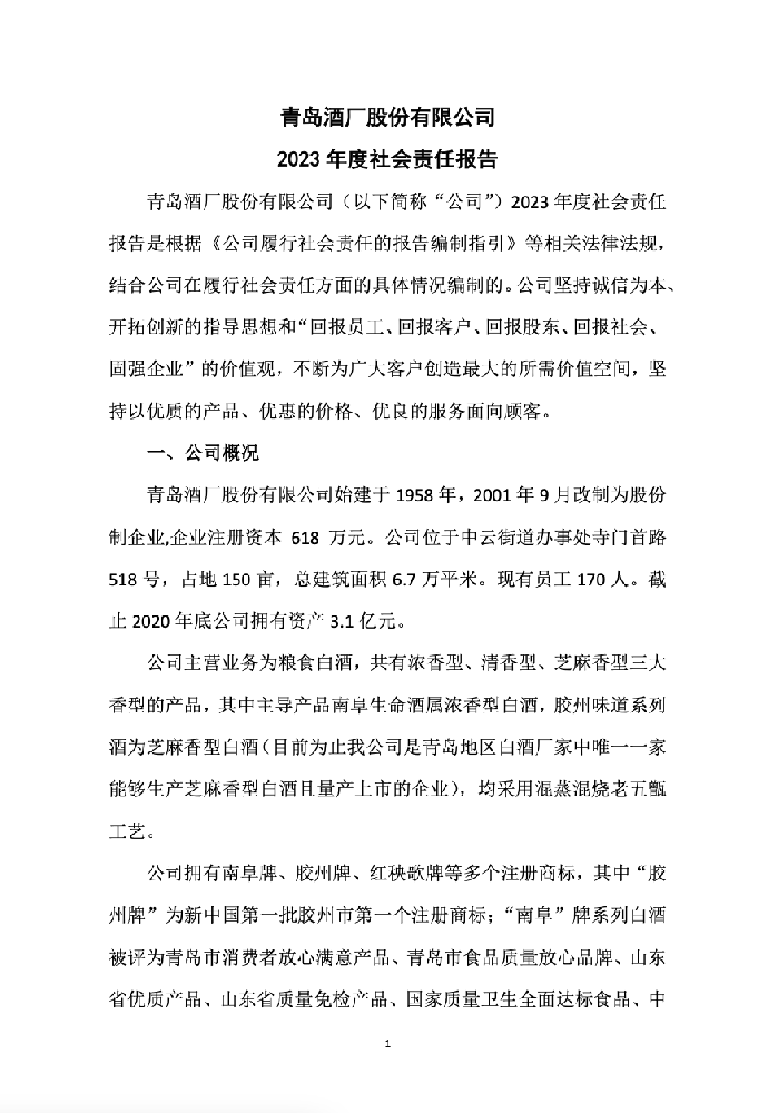 青島酒廠股份有限公司2023年度社會責任報告青島酒廠股份有限公司(以下簡稱“公司”)2023年度社會責任報告是根據《公···